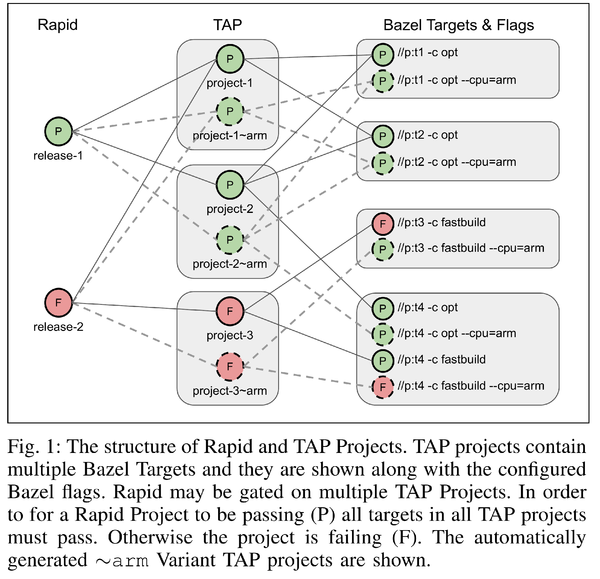 The continuous integration system, TAP, has two phases: TAP Presubmit and TAP Postsubmit. Presubmit runs as part of the developer's "code review loop", executing when they send out changes for review and when they attempt to submit the code to the repository. Because of the massive scale of the repository, TAP Presubmit does not conduct exhaustive testing. Instead, it operates in a "best-effort" mode that attempts to prevent most breakages from escaping into submitted code. TAP Presubmit uses static build dependence-based test selection [12, 16], machine learning driven selection [17], and machine learning driven flakiness mitigation [18]. In this paper, we are focused on TAP Postsubmit's behavior and look forward to analyzing changes to Presubmit in a future manuscript.