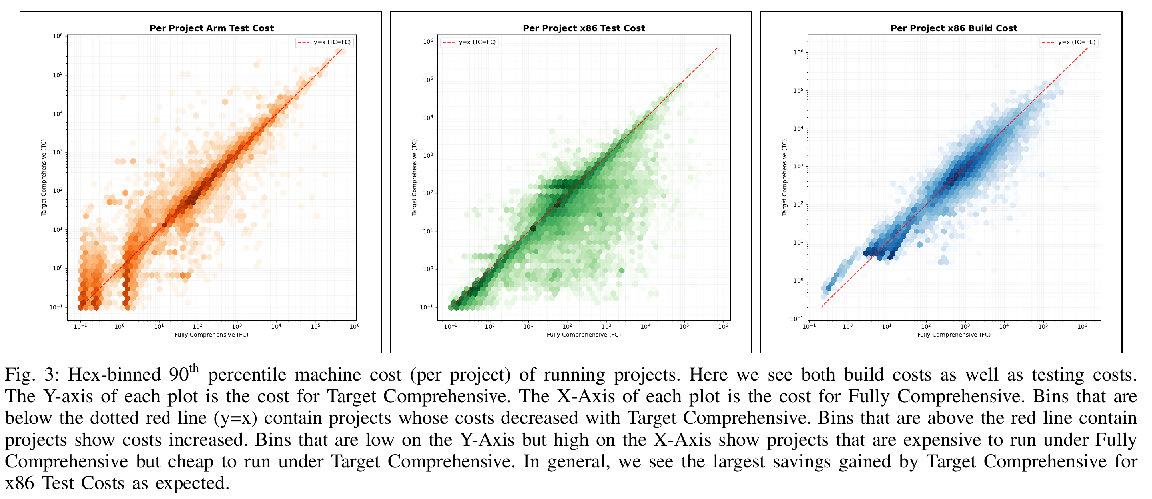 Figure 3 shows a breakdown of machine costs for running projects under Target Comprehensive and Fully Comprehensive testing cycles. As seen in the figure, there is a high variance in project costs. The plots indicate that x86 Test costs were generally lower under Target Comprehensive (as expected), while Arm Test costs were generally higher (as expected). Table 1 summarizes the results of our statistical analysis. We observed total savings of ~25%; statistical analysis confirmed the trends evident in the plots, with the most savings derived from avoiding x86 Testing. However, we also saw a substantial 14.8% decrease in build costs attributable to a decrease in double compilation under TC testing.