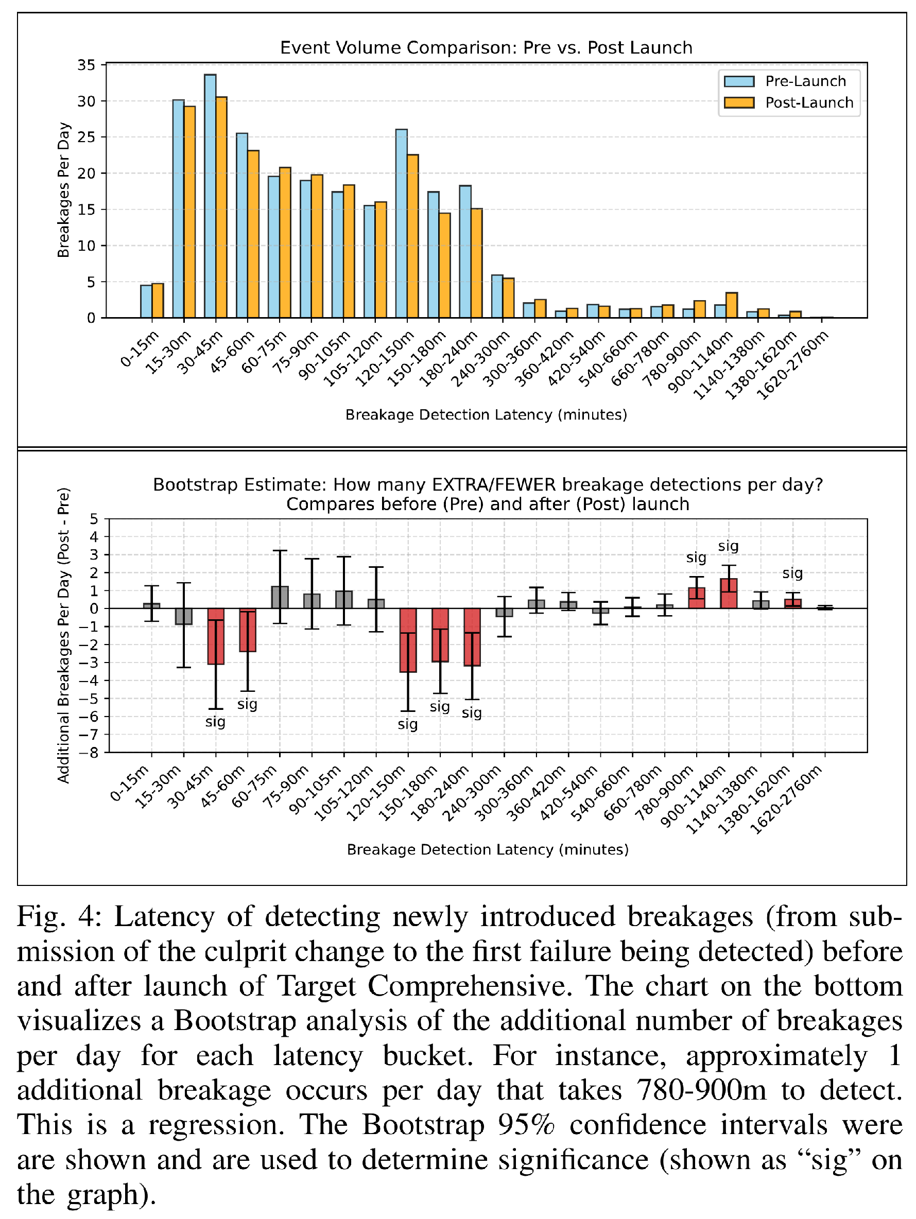 Figure 4 summarizes the results of our analysis. We compared the latency of detecting newly-introduced breakages (from submission of the culprit change to the first failure being detected) before and after launch of Target Comprehensive. While the median breakage detection latency was unchanged, the mean and 90th percentile showed significant changes. To understand why, we plotted a breakdown of the number of breakages occurring in ranges of latencies (ex. 17 breakages in 90 minutes - 105 minutes) before and after. We then used Bootstrap re-sampling to estimate the change in the number of breakages likely to occur in each bucket. As visualized in Figure 4, the results indicate that we can expect approximately 4 additional breakages per day that take more than 12 hours to detect. This is a regression and a cost of Target Comprehensive testing as implemented today. We look forward to further optimizations to address this in the future.