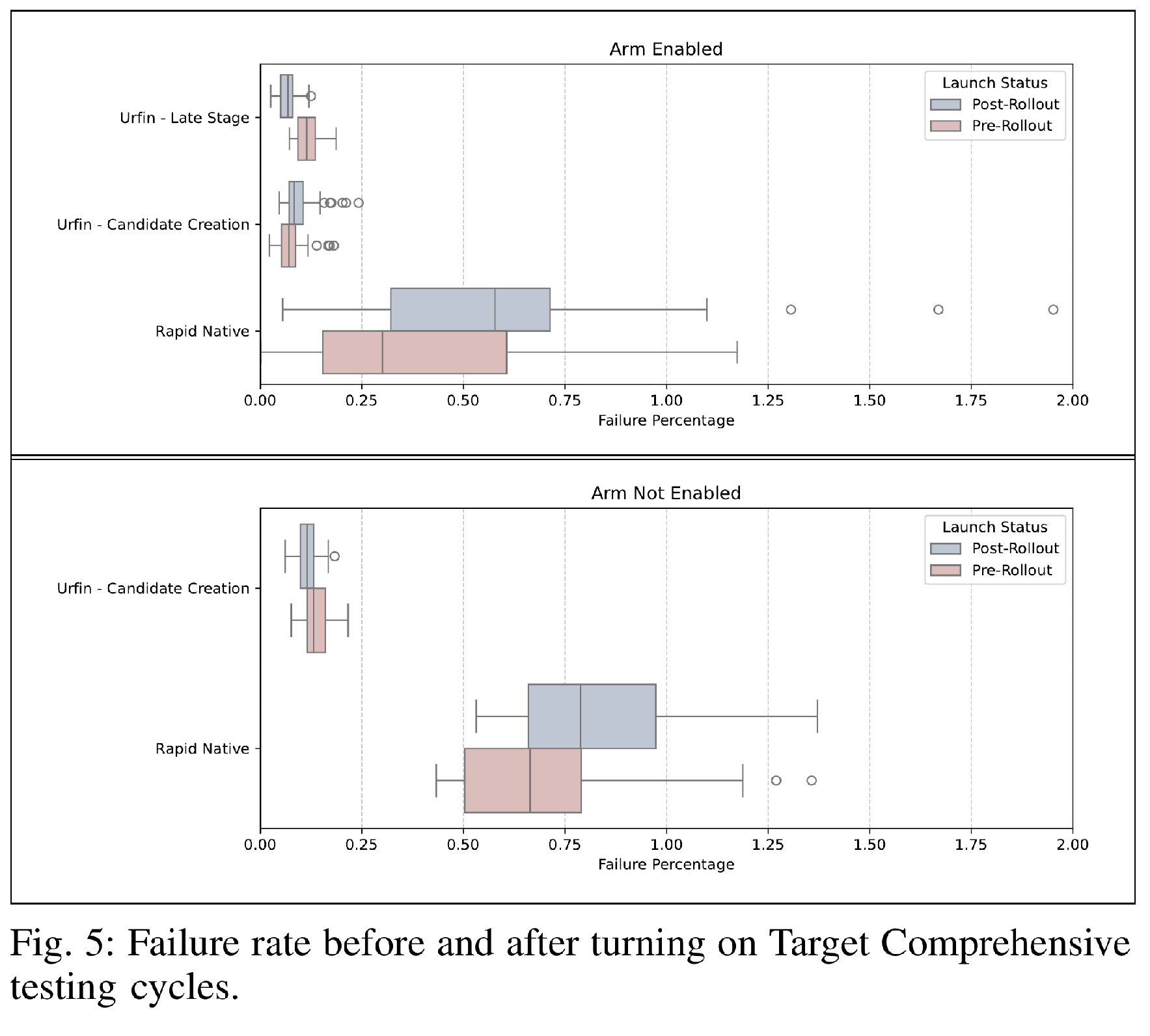 Figure 5 illustrates the distribution of release-time testing failures for projects with Arm enabled versus disabled, distinguishing rates before and after the rollout of Target Comprehensive testing. In general, the Urfin failure rate is approximately 1/10th that of Rapid Native. Notably, Arm-disabled Rapid Native projects (which were unaffected by the rollout) also saw a regression during this period, suggesting a potential global regression in failure rates unrelated to the launch.